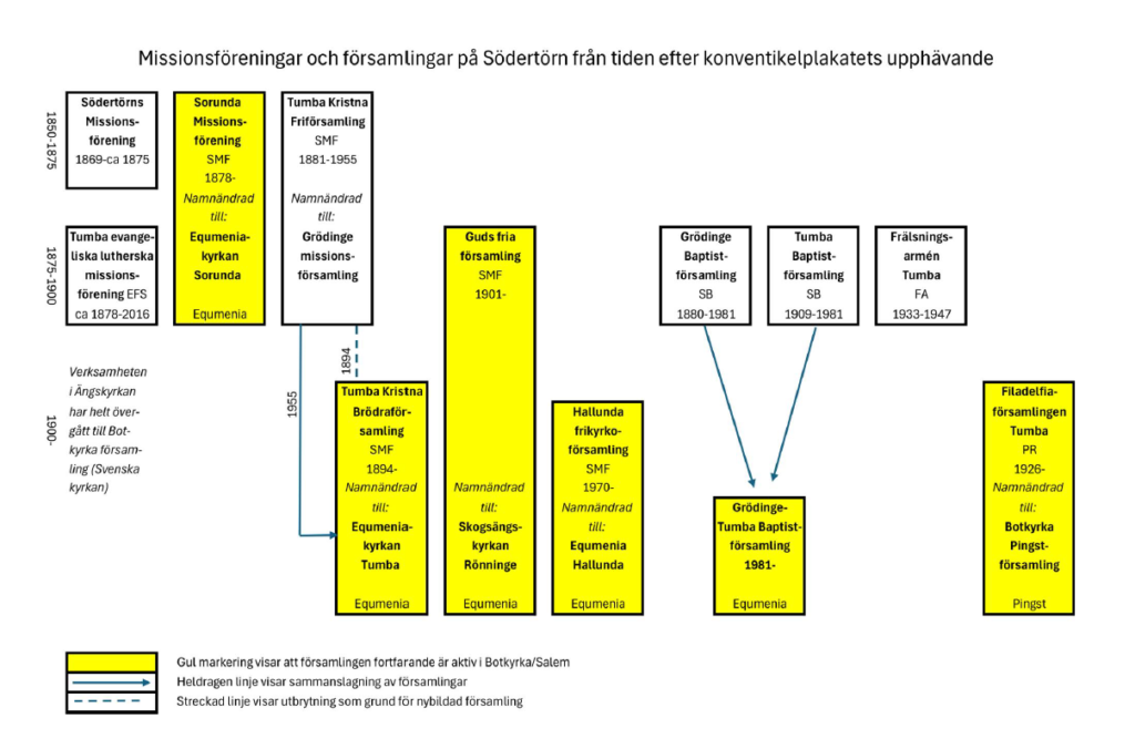 på den här skissen kan du se hur frikyrkorörelsen på Södertörn har utvecklats fram till nutid.